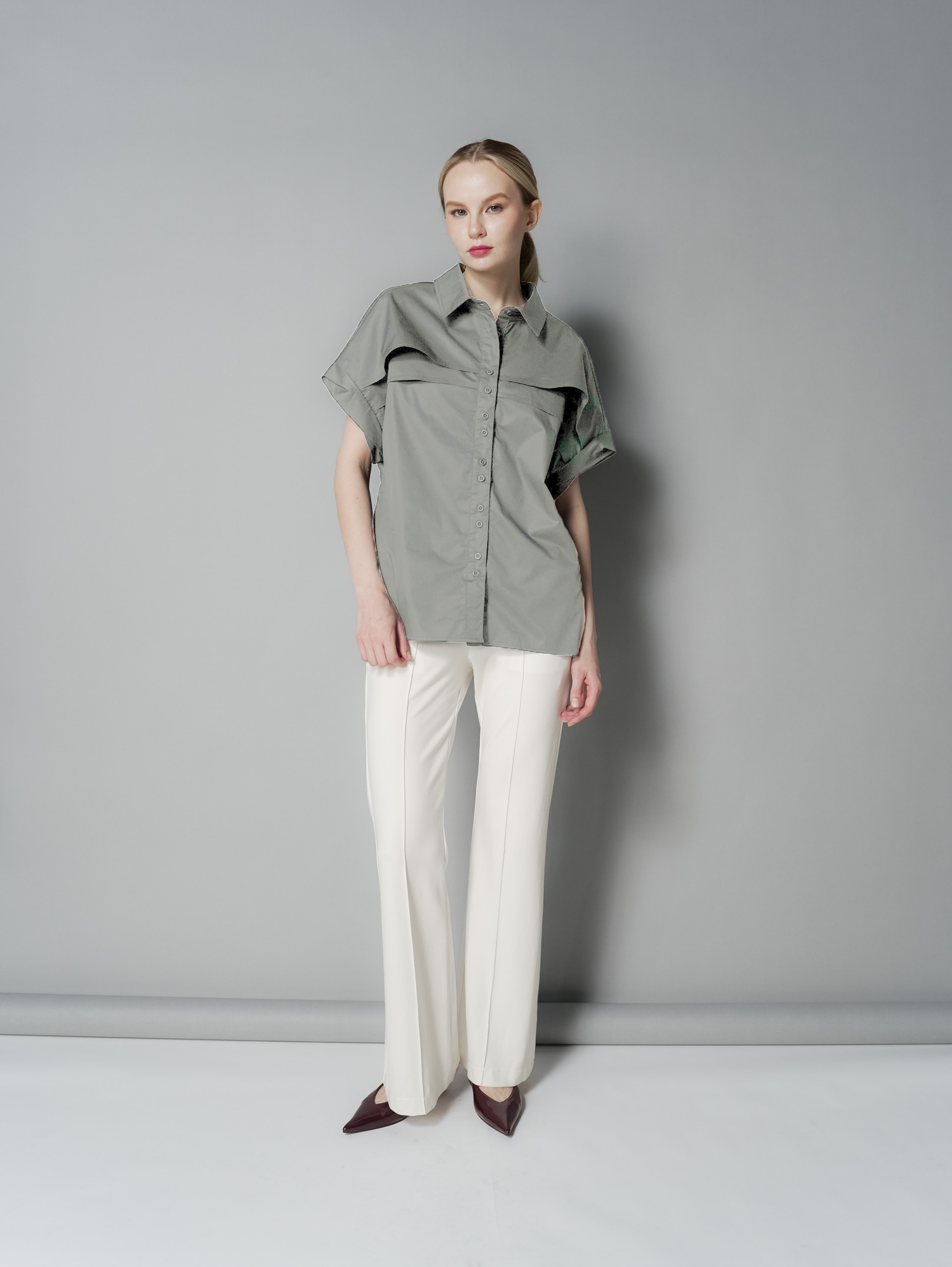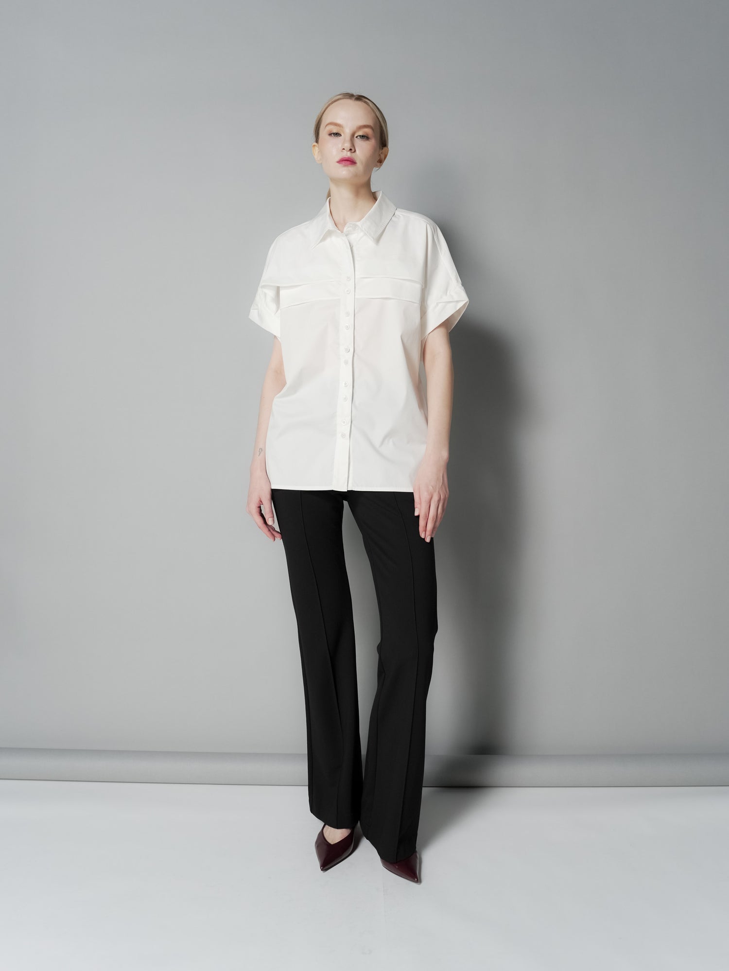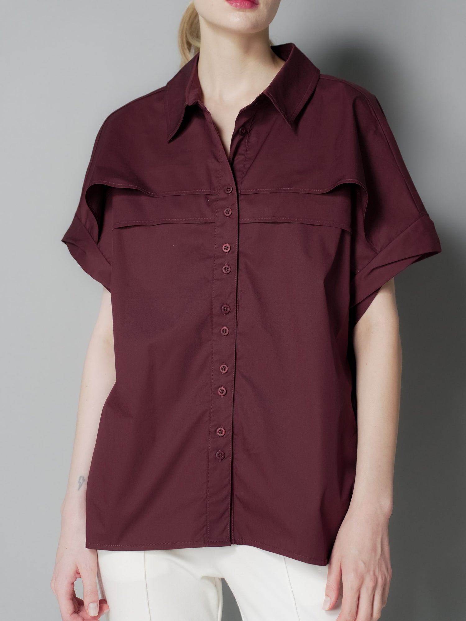Elevate your wardrobe with the Ara Extended Sleeve Top, featuring a sharp collar button-down design for a polished look. The unique aleeve opening tuck detail adds subtle sophistication, while the front chest layer detail enhances texture and style. Perfect for both professional and casual settings, this top combines elegance with modern flair to keep you confidently stylish all day.