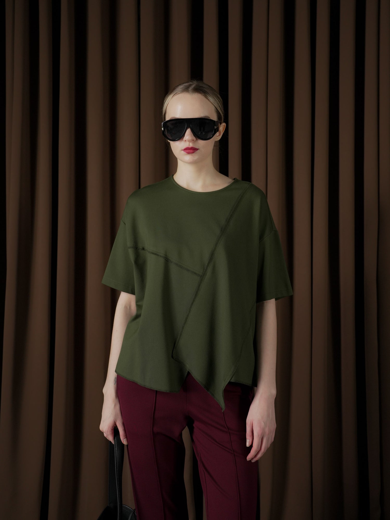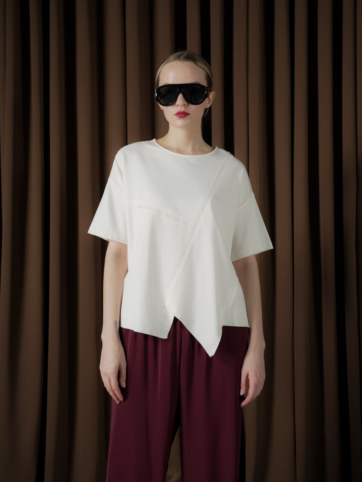 Indulge in the luxury of the Florence Edging Detail Top. This classic tee boasts an asymmetrical hem and exquisite edged seam details for a unique and sophisticated look. Elevate your wardrobe with this timeless piece that is sure to turn heads and make a statement.