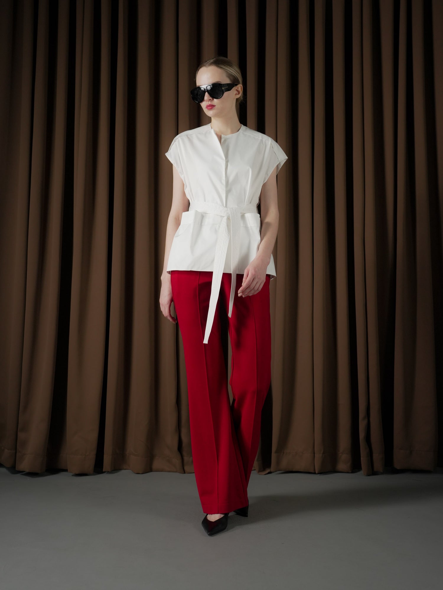 Elevate your wardrobe with the Ivanka Top featuring a flattering round neck and a practical front patch pocket. The adjustable self-fabric waistband belt enhances your silhouette, adding a touch of elegance and versatility. Perfect for both casual and polished looks, this vest top combines style and function effortlessly.