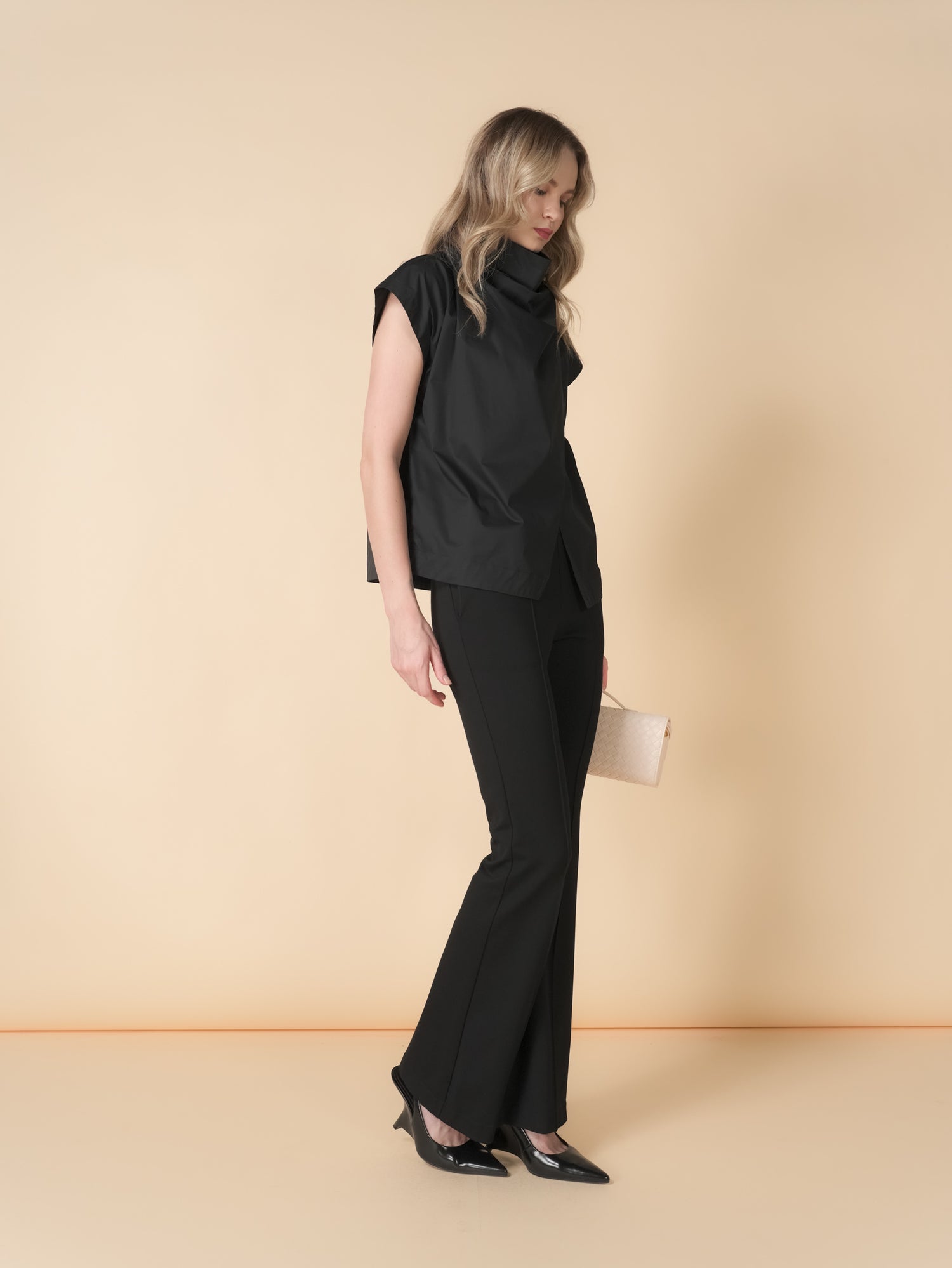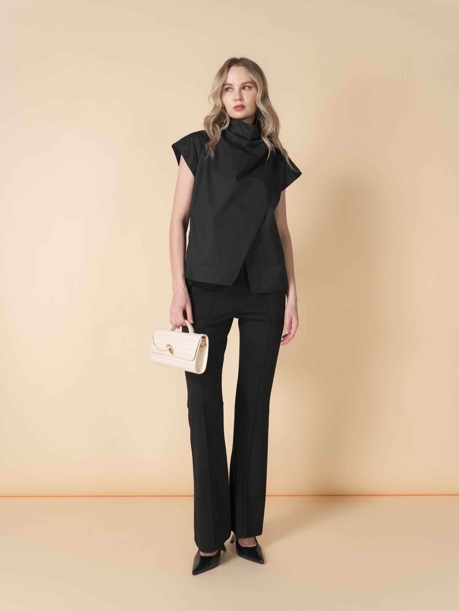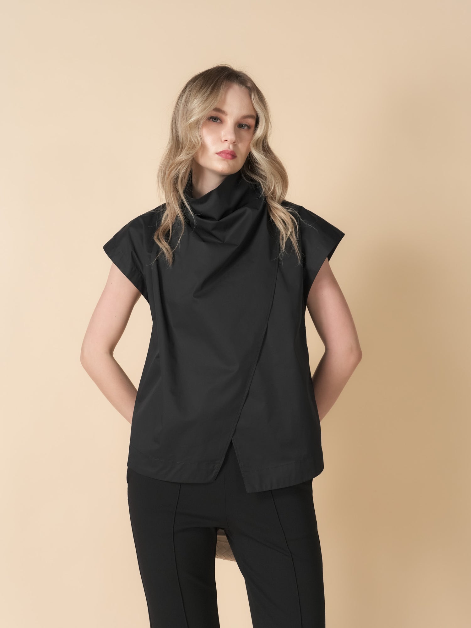 The Kira Wrap Cowl Neck Top offers a sleek sleeveless design paired with a softly draped cowl neck for effortless elegance. Crafted from crisp poplin fabric, it delivers a polished look while keeping you comfortable. Perfect for layering or wearing on its own, this top adds a touch of sophistication to any outfit.
