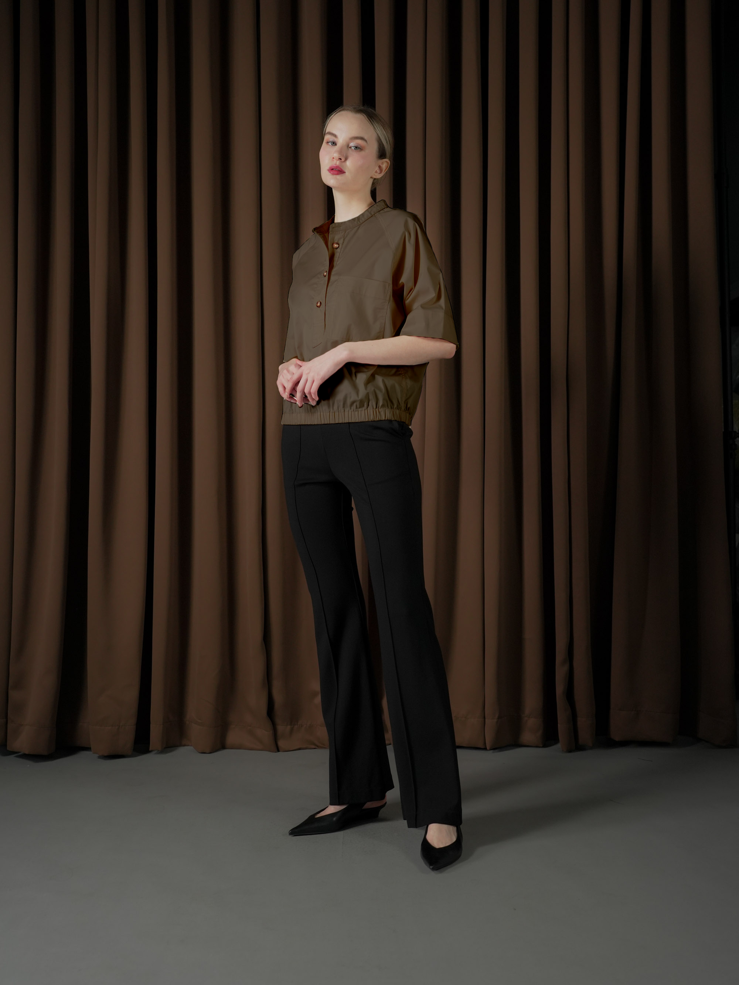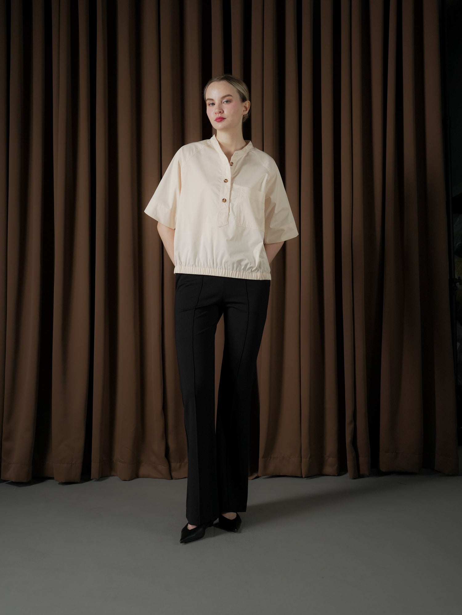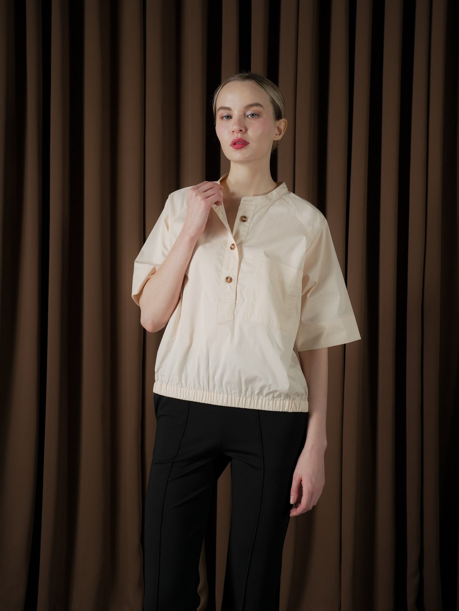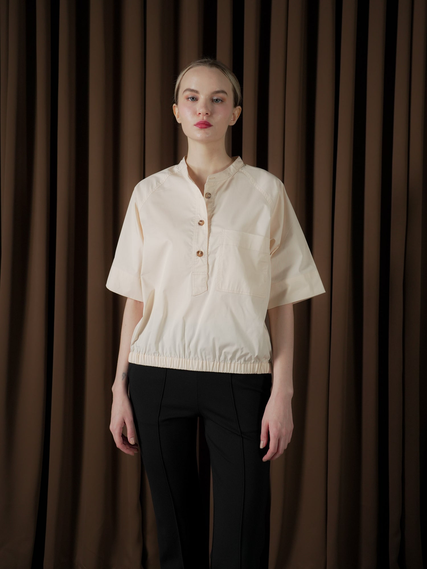 Introducing the Yassi Gartered Hem Polo. This expertly crafted polo features a unique raglan mandarin collar for a sophisticated look, while the gartered hem adds a touch of modern style. With its convenient front button closure and practical front patch pocket, this polo is both functional and fashionable. Elevate your wardrobe with the Yassi Gartered Hem Polo.